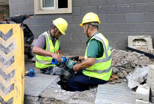 在水木華園改造現場,身著工裝的工作人員正俯身組裝自來水管道閘門。該小區原有供水管網因年代久遠,管道內壁銹蝕嚴重,且多處出現滲漏點,直接導致小區整體水壓不足,影響居民正常生活。改造前期,新海管線所已通過專業聽漏設備檢測與精準勘察,確定了改造方案。